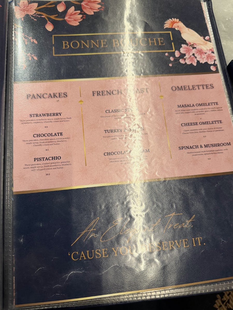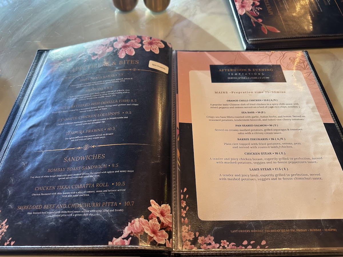 As the day unfolds, the menu offers a range of light yet flavorful choices such as Eggs Benedict and Samosa Chaat, blending traditional and contemporary influences. Seafood options like Sea Bass and Orange Chilli Chicken bring a delicate balance of freshness and warmth, aligning well with the restaurant’s soft pink, cozy setting.